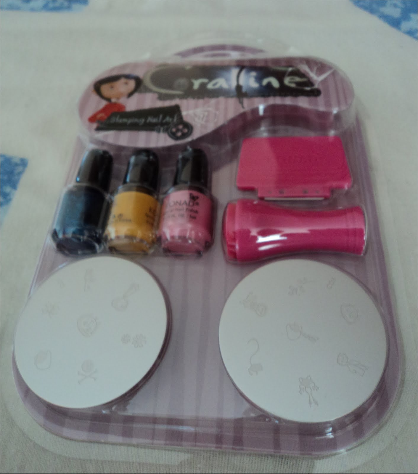 Olá pessoal ! Recentemente fiz uma nova compra usando o Ebay. Comprei um Kit de carimbo para as unhas da Konad Coraline, através de uma vendedora dos Estados unidos. O valor do produto foi de $30 (o que seria atualmente seria equivalente a R$ 48,77). O frete foi totalmente grátis. O tempo de espera até o produto chegar foi de 28 dias. Abaixo tá a fotos do produto e depois algumas fotos de unhas feitas usando essa técnica de carimbo