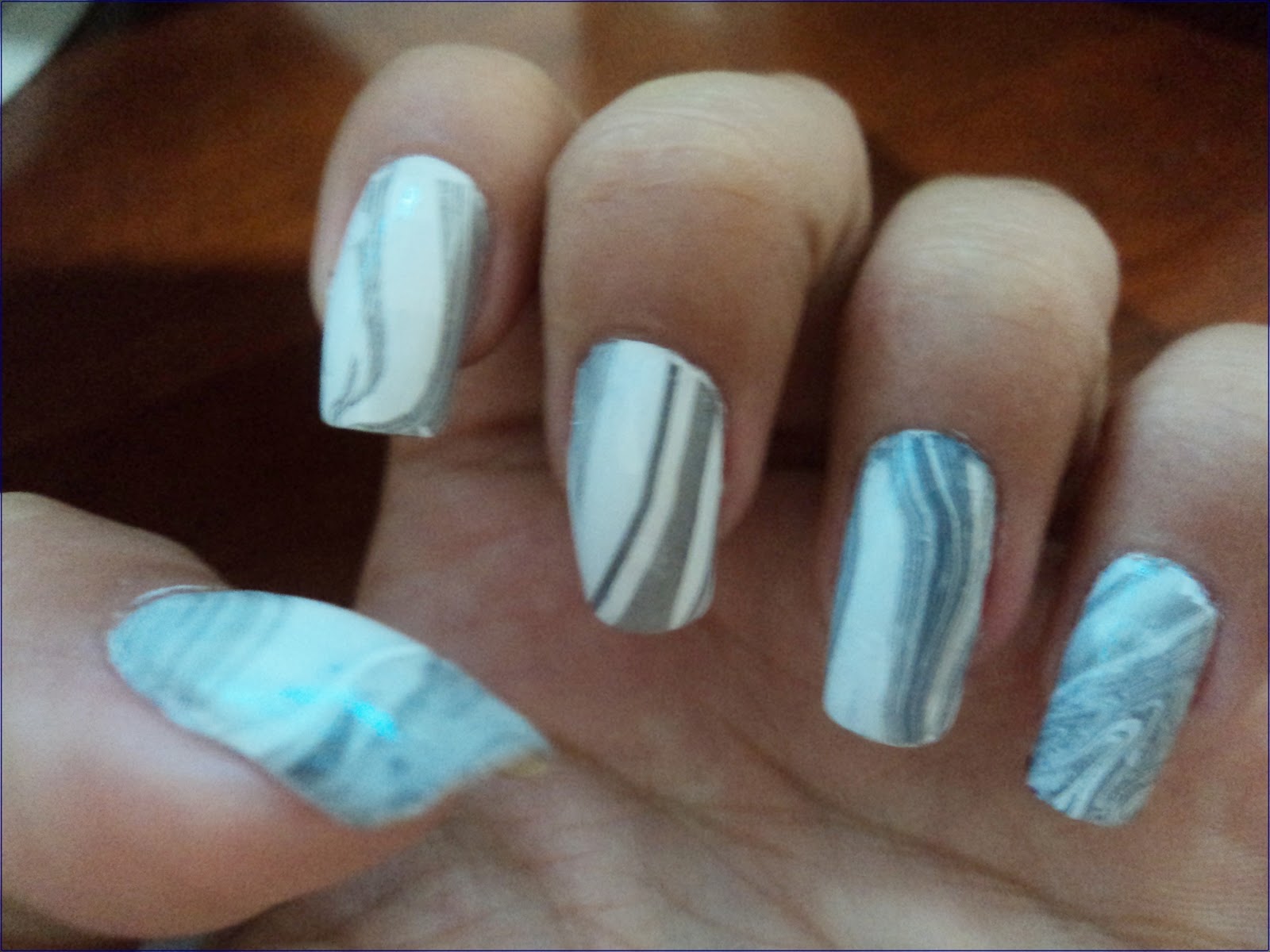 - Mármore com pincel: feito diretamente na unha com a ajuda de um pincel fino ou boleador.