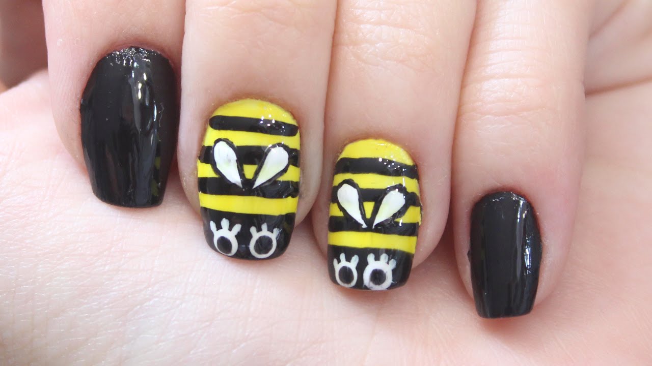 - Desenhe as listras: Com um pincel fino e esmalte preto, faça listras horizontais imitando o corpo da abelha em uma ou mais unhas.